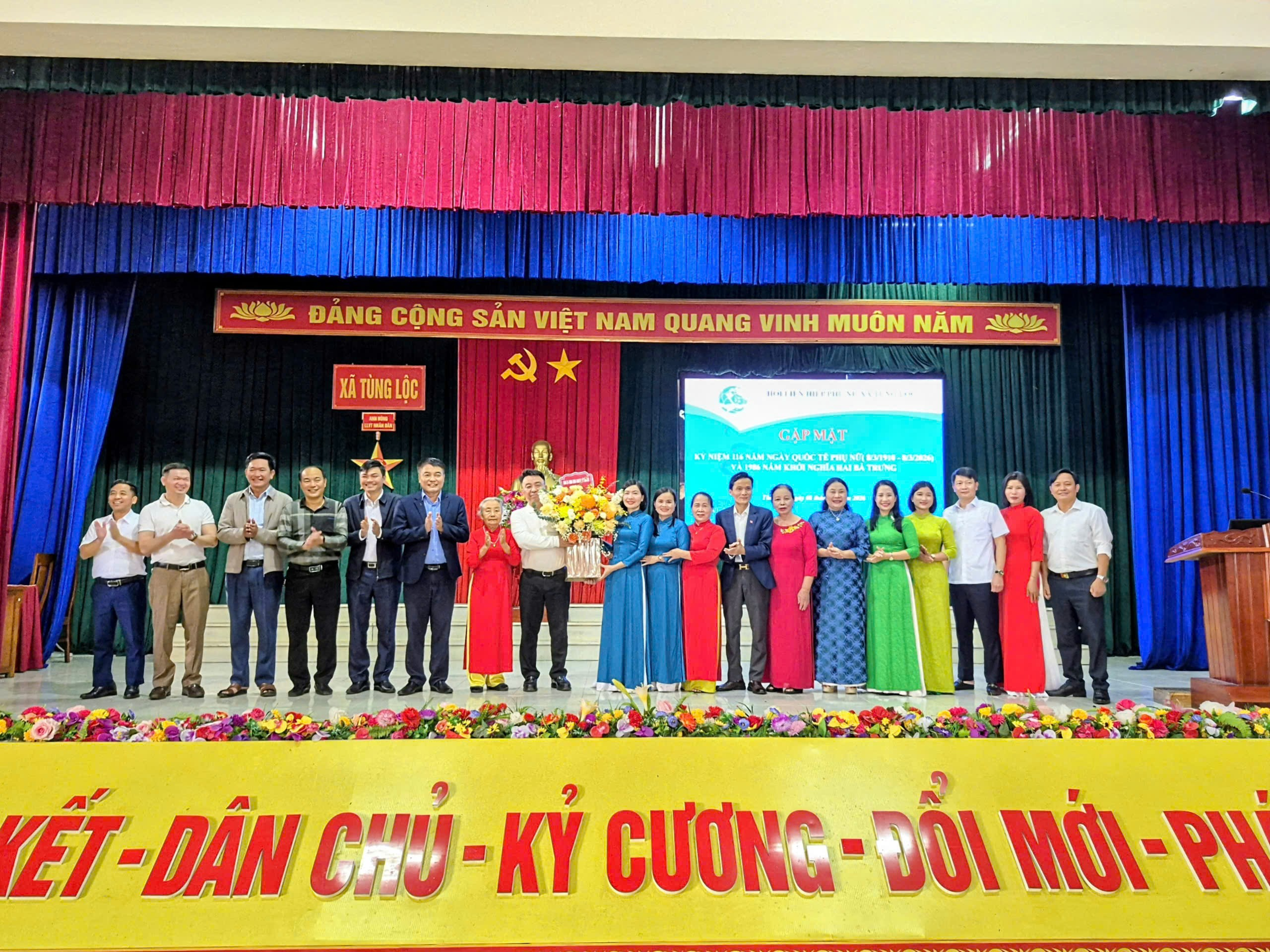Nhân dịp này, lãnh đạo Đảng ủy, HĐND, UBND, UBMTTQ xã đã tặng hoa chúc mừng Hội Liên hiệp Phụ nữ xã Tùng Lộc, thể hiện sự quan tâm, động viên đối với đội ngũ cán bộ, hội viên phụ nữ toàn xã.