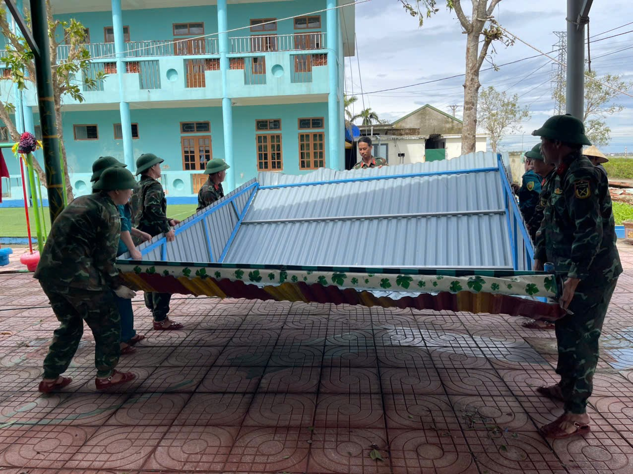 Lực lượng dân quân xã phối hợp với lực lượng quân sự PTKV 1 giúp trường Mầm non khắc phục hậu quả sau bão số 10