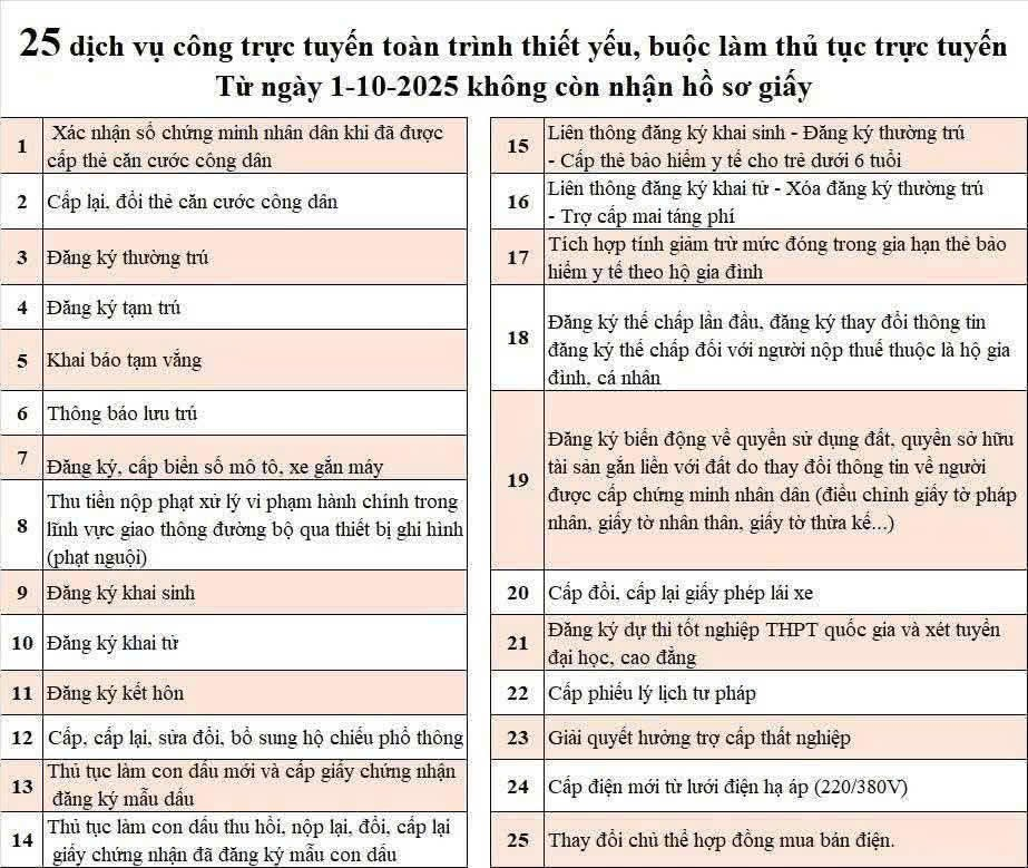 Từ ngày 01/10/2025, Chính phủ sẽ chính thức chuyển đổi 25 dịch vụ công thiết yếu sang hình thức trực tuyến hoàn toàn (toàn trình).