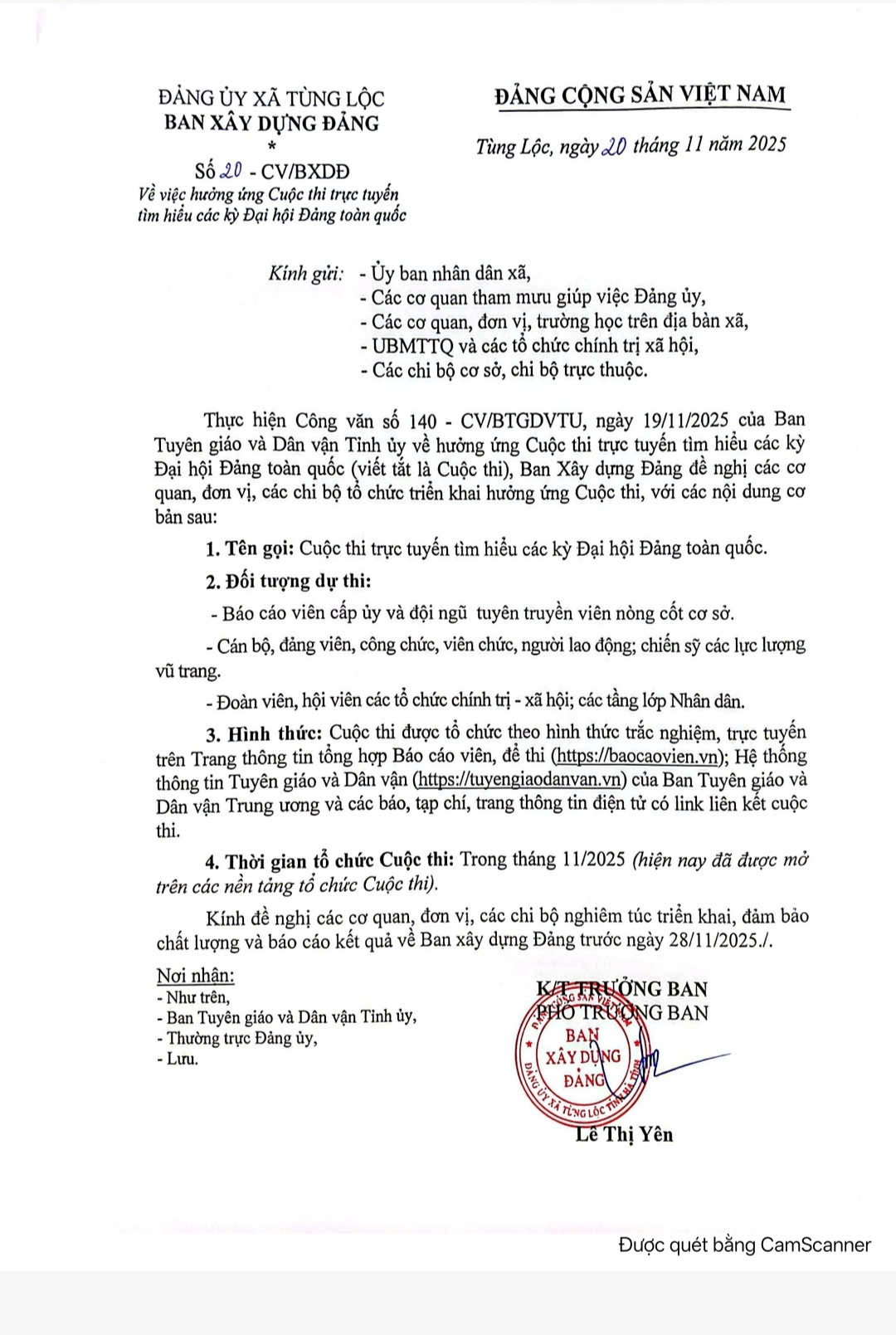 Thực hiện công văn số 140-CV/BTGDVTU, ngày 19/11/2025 của ban tuyên giáo và dân vận tỉnh ủy về việc hưởng ứng cuộc thi trực tuyến tìm hiểu các kỳ đại hội Đảng toàn quốc, ngày 24/11/2025 Đảng ủy xã Tùng Lộc ban hành Công văn số 20-CV/BXDĐ về việc hưởng ứng cuộc thi trực tuyến tìm hiểu các kỳ đại hội Đảng toàn quốc (cụ thể có công văn gửi kèm)
