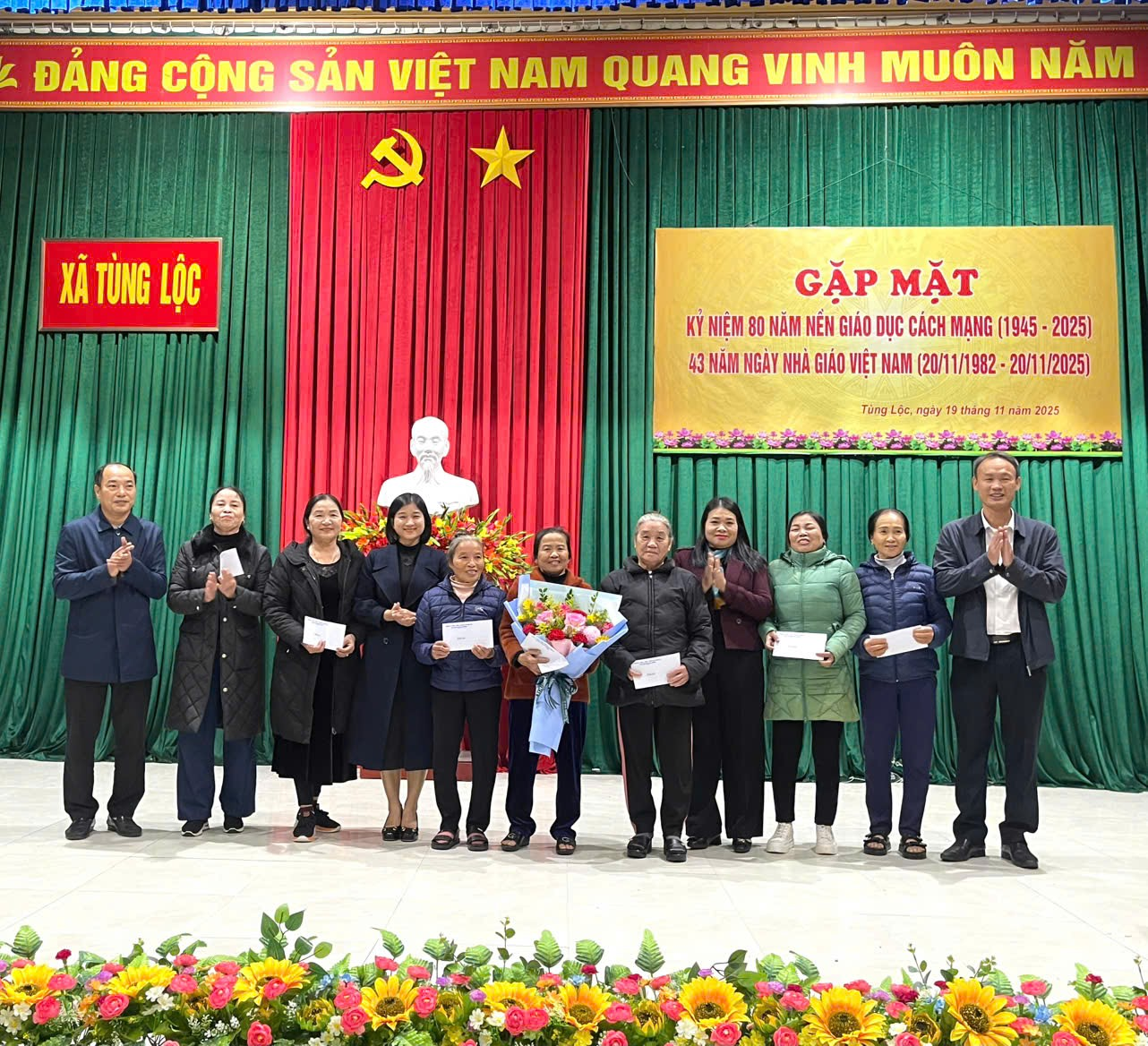 Nhân dịp này, UBND xã đã tặng hoa chúc mừng các trường học và tri ân các thầy cô giáo đã có nhiều cống hiến cho sự nghiệp giáo dục địa phương. Buổi lễ gặp mặt kỷ niệm 20/11 khép lại trong không khí trang trọng, thân tình và đầy ý nghĩa, thể hiện đạo lý “Tôn sư trọng đạo” của dân tộc, đồng thời tiếp thêm động lực để đội ngũ nhà giáo xã Tùng Lộc tiếp tục nỗ lực, đổi mới, đóng góp tích cực vào sự nghiệp giáo dục của quê hương.