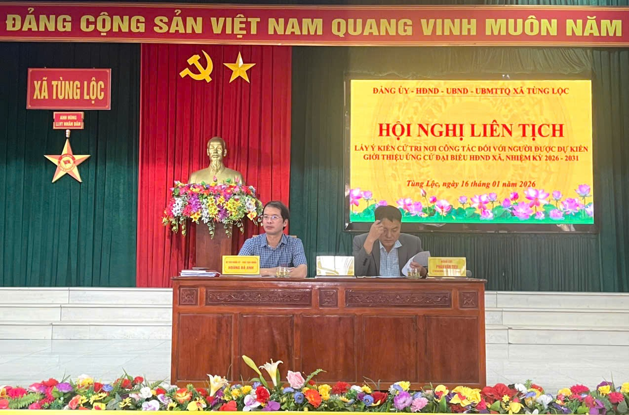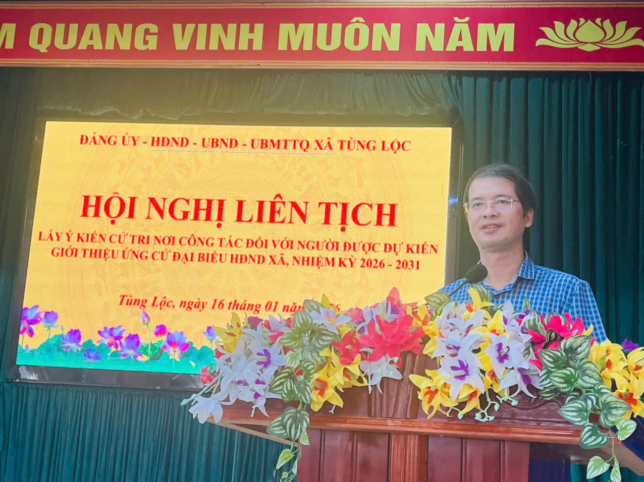 Thực hiện Luật Bầu cử đại biểu Quốc hội và đại biểu Hội đồng nhân dân; căn cứ kế hoạch hiệp thương của Ủy ban Mặt trận Tổ quốc Việt Nam xã Tùng Lộc, chiều ngày 16/01/2026, cơ quan Đảng ủy, HĐND, UBND, UBMTTQ xã tổ chức Hội nghị liên tịch lấy ý kiến cử tri nơi công tác đối với người được dự kiến giới thiệu ứng cử đại biểu HĐND xã Tùng Lộc, nhiệm kỳ 2026 – 2031 đã được tổ chức theo đúng quy định.